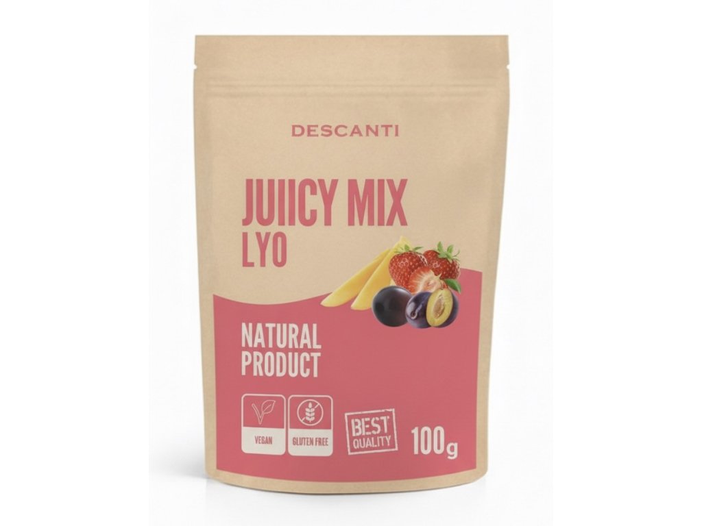 Lyofilizované ovoce: jahoda (25 %), mango (25 %), švestka (25 %), hrozny (25 %).